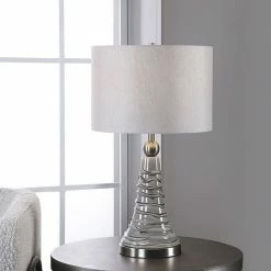 Cheap 🥰 Unbranded Amber Art Glass Base Table Lamp With Round Linen Drum Shade & Chrome Details 😀