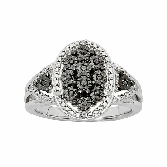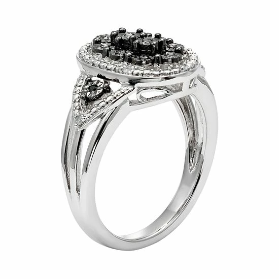 Dramatic beauty is effortless with this sterling silver ring. Black miracle-set diamonds framed by white diamonds and beaded details create a stunning oval design you’re sure to love.