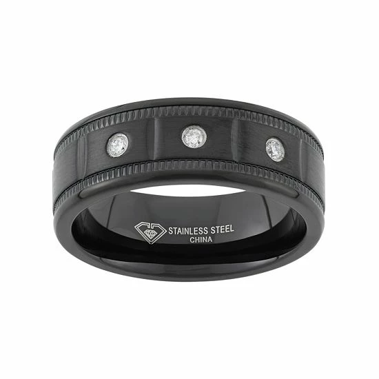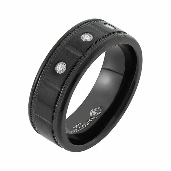 Three round-cut diamonds and milgrain details make this men’s black ion-plated stainless steel wedding band a contemporary way to showcase your commitment.