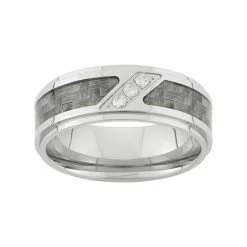 Carbon fiber inlays and a diagonal row of diamonds makes this men’s stainless steel wedding band a handsome way to stand out from the crowd.