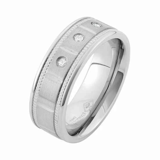 Three round-cut diamonds and milgrain details make this men’s stainless steel wedding band a contemporary way to showcase your commitment.