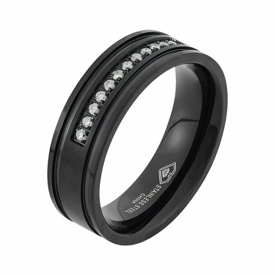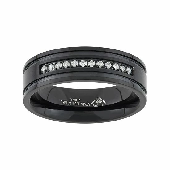This men’s black ion-plated stainless steel wedding band, featuring a row of round-cut diamonds and grooved details, is a stunning choice.