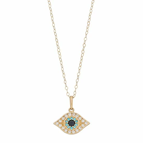 Decorated with blue and white cubic zirconia stones, this 10k gold evil eye pendant makes a unique style accessory.