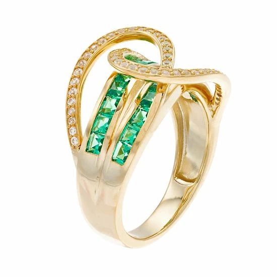 Featuring a unique swirled band adorned with emeralds and diamonds, this 10k gold ring is an alluring accessory.