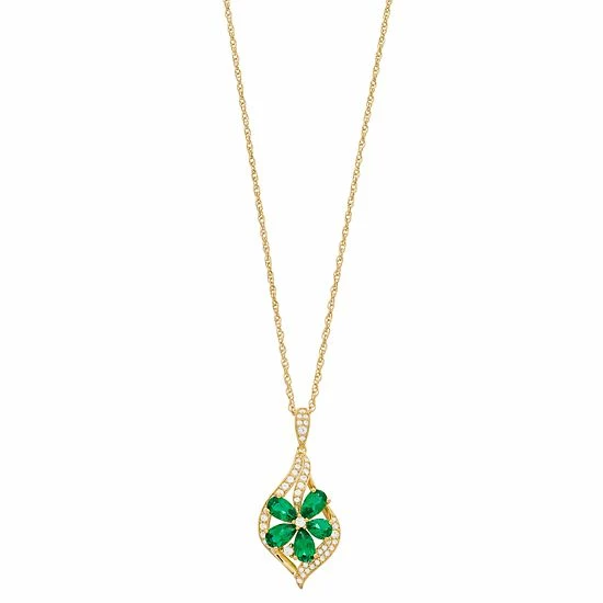 Decorated with emerald petals and diamond accents, these 10k gold flower pendant completes your look in a lovely way.
