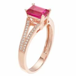 Adorned with an emerald-cut ruby center stone accented with diamonds, this 10k rose gold ring is absolutely stunning.