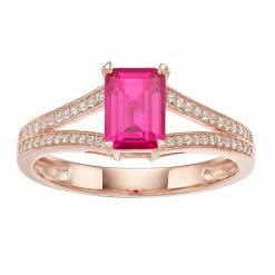 Adorned with an emerald-cut ruby center stone accented with diamonds, this 10k rose gold ring is absolutely stunning.