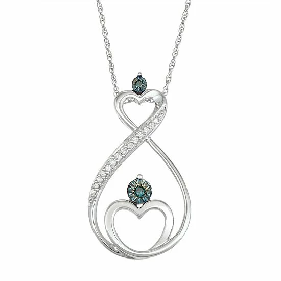 A heart infinity pendant decorated with blue and white diamonds lends awe-inspiring beauty to this 10k white gold motherly love necklace.