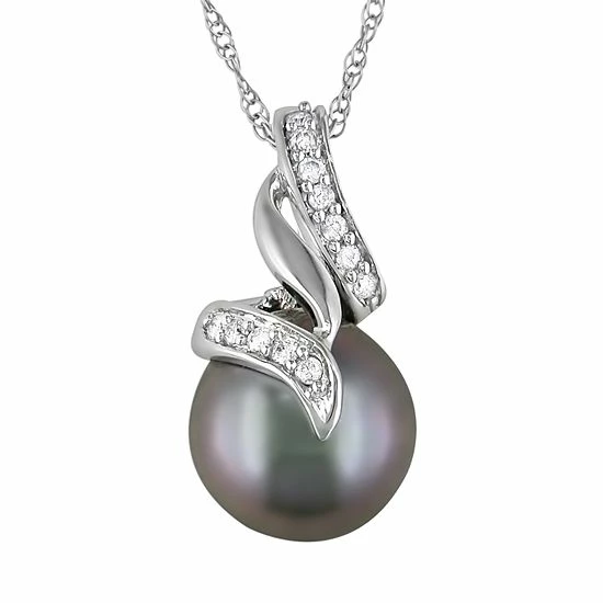 Absolute beauty. A Tahitian cultured pearl set in a diamond-accented swirl design gives this pendant exquisite elegance. Enhance any ensemble when you wear this 10k white gold necklace.