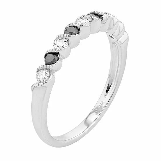 Accent your look with this stunning 10k white gold ring adorned with black and white diamonds for a glamorous effect.