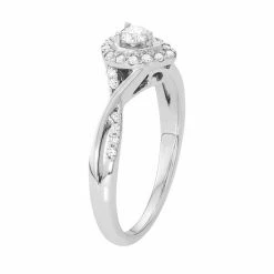 A teardrop halo motif covered in round-cut diamonds serves as the focal point on this 10k white gold engagement ring, while a twisted band completes the gorgeous design.