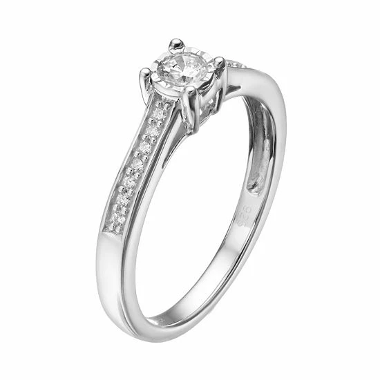 Ask for forever with this elegant 10k white gold diamond engagement ring. A round-cut diamond center stone serves as the focal point, while diamond accents adorn the band with eye-catching sparkle.
