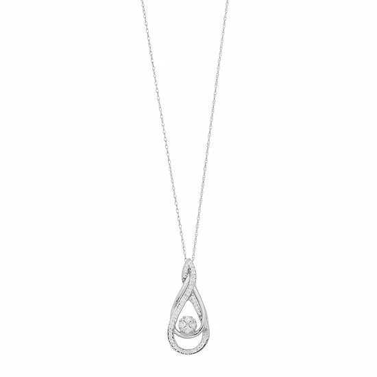 Tantalize with this 10k white gold twisted pendant necklace. Diamonds decorate the pendant’s dainty, dazzling design.