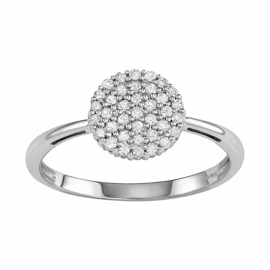 A cluster of round-cut diamonds provides a unique focal point on this chic 10k white gold engagement ring.