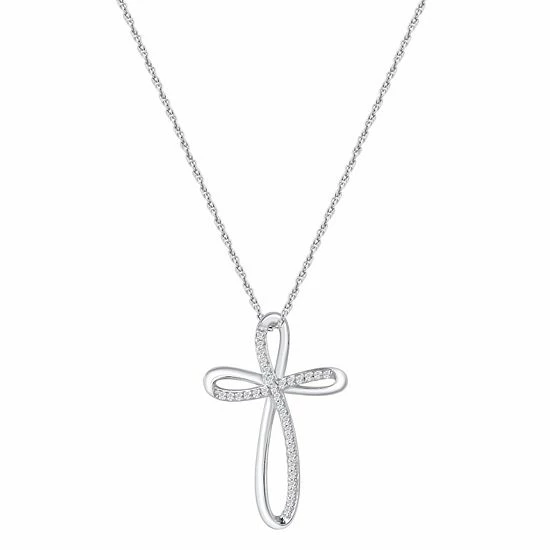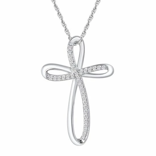 This 10k white gold cross pendant is a lovely way to showcase your faith. Round-cut diamonds and an infinity detail give this necklace unending beauty.