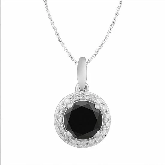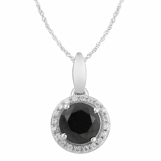 With a round-cut black diamond center stone encompassed by round-cut white diamond accents in a halo motif, these 10K white gold button pendant necklace simply elegant.