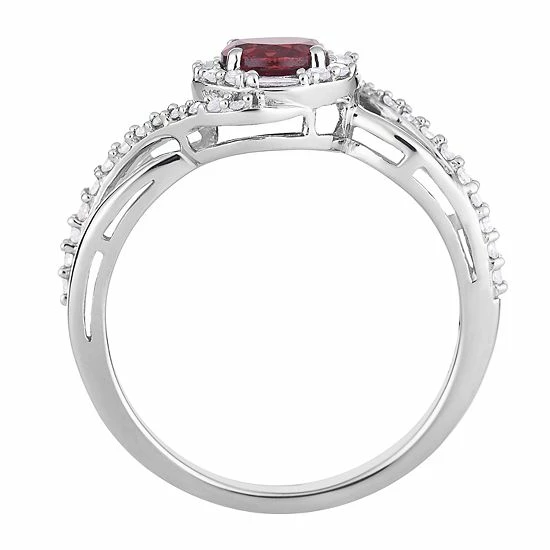 This 10k white gold swirl ring is sure to impress. Its round-cut garnet center stone is beautifully complemented by swirls of round- and baguette-cut diamonds.