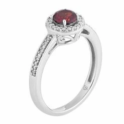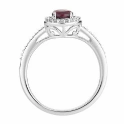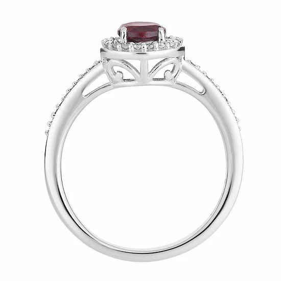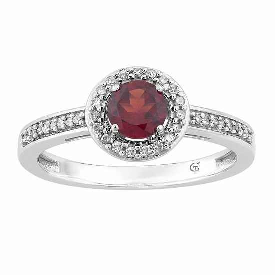 Adorned with a round-cut garnet center stone framed with dazzling diamonds, this 10k white gold halo ring captivates from every angle.