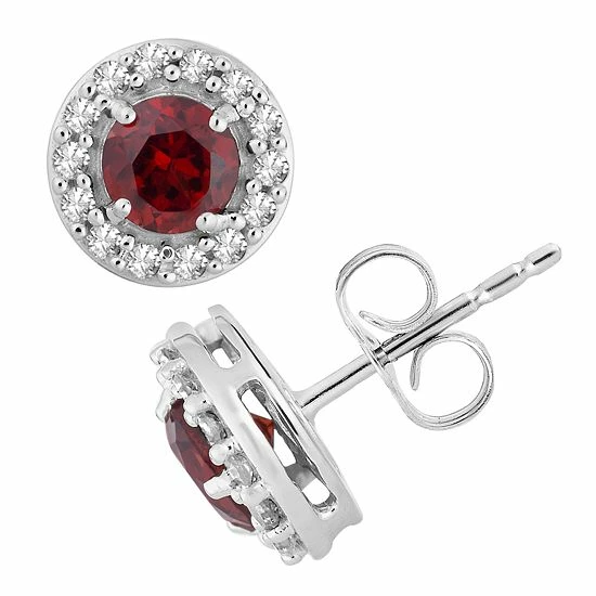 Decorated with round-cut garnets and a halo of scintillating diamonds, these 10k white gold earrings lend a touch of elegance to your ensembles.