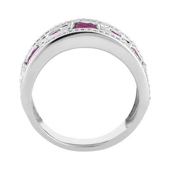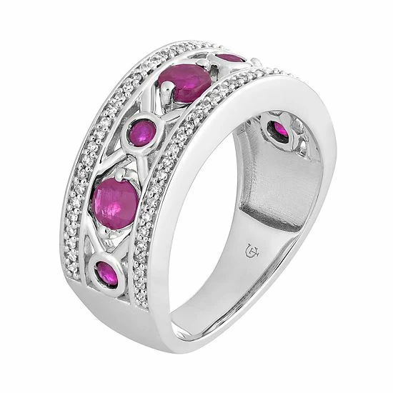 Decorated with alternating large and small round-cut rubies set within an “X” pattern, this 10k white gold ring lends a touch of distinction to your ensembles.