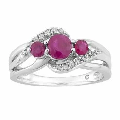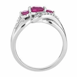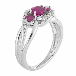 A trio of genuine rubies and diamond accents beautifully adorn this 10k white gold ring, making it a elegant complement to your attire.