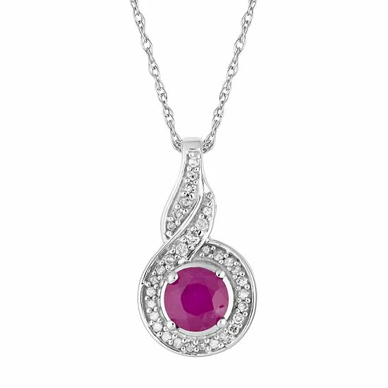 Featuring a classic halo design, but with a twist, this 10k white gold ruby and diamond pendant complements your attire in a uniquely beautiful way.