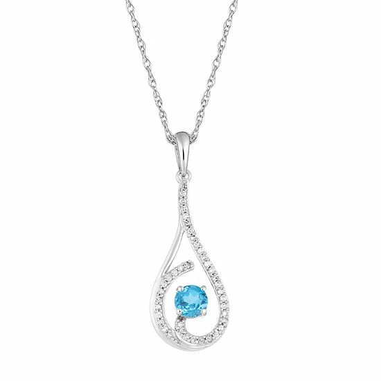Decorated with a round-cut Swiss blue topaz stone set within a swirling teardrop motif, this 10k white gold pendant is an elegant complement to your attire.