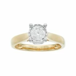 Take her breath away when you present her with this 14k gold engagement ring. A round-cut diamond set in a miracle plate setting provides the illusion of a larger diamond, while diamond accents offer scintillating shine to this stunning ring.