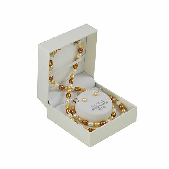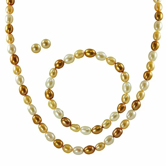 You’re sure to shine wearing this 14k gold necklace, stretch bracelet and stud earring set. Featuring dyed freshwater cultured pearls, this jewelry set is glamorous and glowing. Illuminate any ensemble with this stunning set.