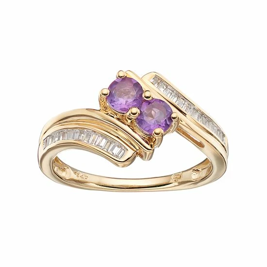 Decorated with two amethyst center stones and illuminating lab-created white sapphire accents, this 14k gold over silver ring offers alluring appeal.