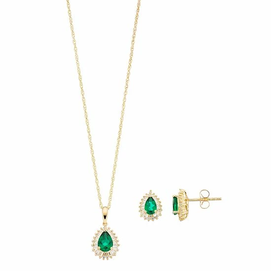 Decorated with an illuminating pear-cut, lab-created emerald center stones, this 14k gold over silver pendant and earring set abounds with scintillating style.
