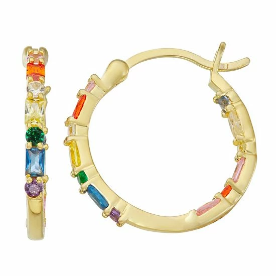 These gorgeous 14k gold over sterling silver rainbow cubic zirconia accent inside out hoop earrings are the perfect way to finish any outfit.