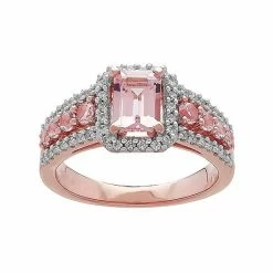 An emerald-cut simulated morganite center stone encircled with cubic zirconia accents lends elegant appeal to this beautiful halo ring. Further detailed with cubic zirconia stones along the band, this ring provides eye-catching sparkle.