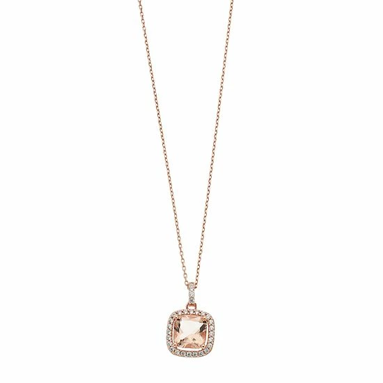 Featuring a cushion-shaped simulated morganite center stone framed with dazzling white CZ accents, this 14k rose gold over silver pendant necklace lends timeless elegance to your look.