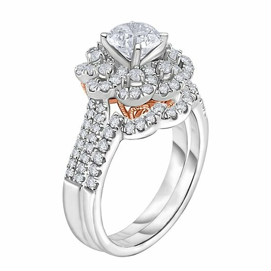 Featuring tiers of dazzling diamonds set in a floral motif, this two-tone 14k gold halo engagement ring is a beautiful symbol of your love and commitment.