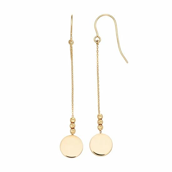 These beautiful 14k yellow gold disc bead linear drop earrings are just the pair your jewelry collection has been missing.