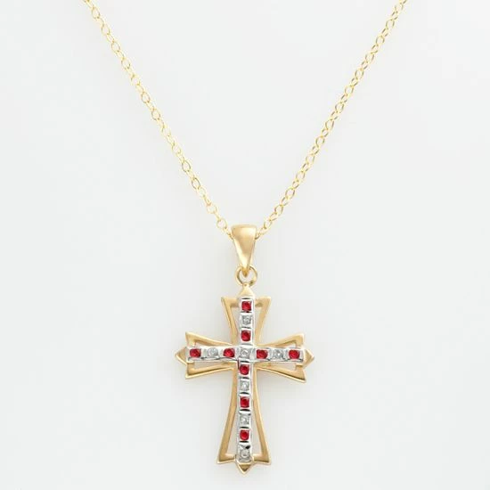 You’ll have divine beauty wearing this cross pendant. This 18k gold-over-sterling silver cross pendant features ruby stones and diamond accents. Showcase your heavenly style by adding this cross pendant to your jewelry collection.