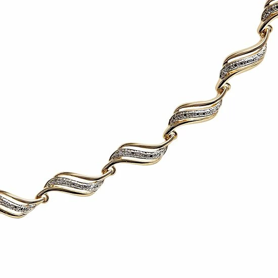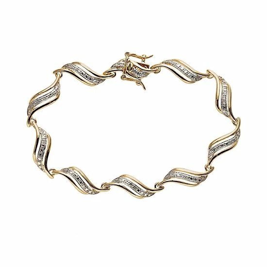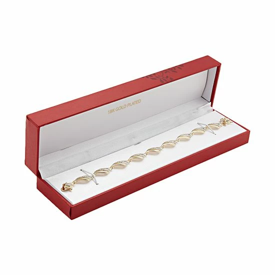 How beautiful. A swirl design decorated with one tiny diamond accent and textured rhodium-plated details gives this bracelet unmatched elegance. Delight her with this 18k gold-plated bracelet and a shimmering pair of drop earrings.