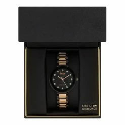 A two-tone finish and a bold black dial make this women’s watch an eye-catching accessory.