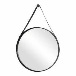 This mirror uses a wide strap and is finished in an antiqued bronze.
