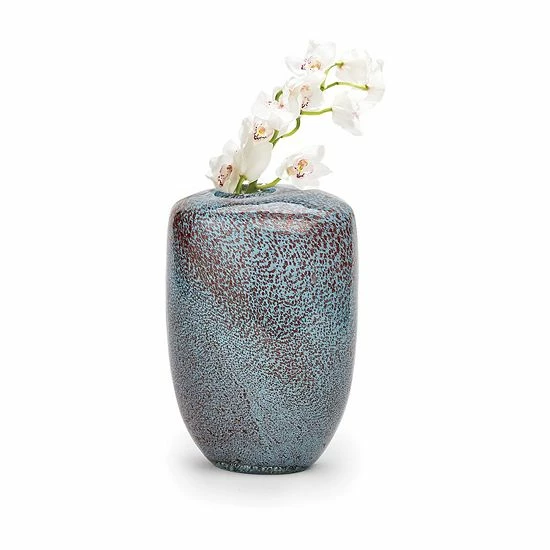 The handmade design of the Aqua Gold Hand-Blown Vase is crafted by melting and swirling bits of colored glass to create a luminous, home for your favorite flowers.