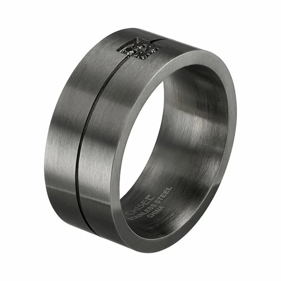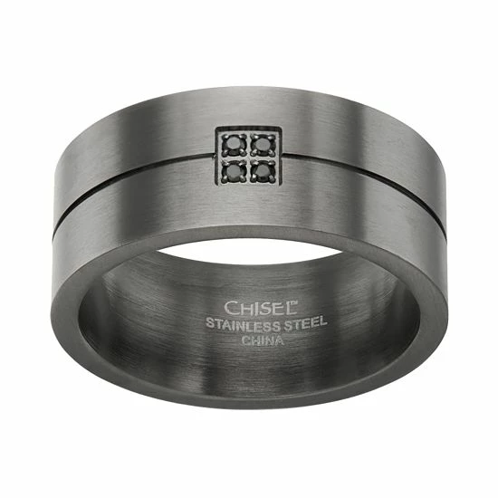 Black diamond accent stones and striped design make this men’s stainless steel band a handsome addition to any attire.