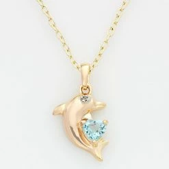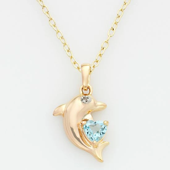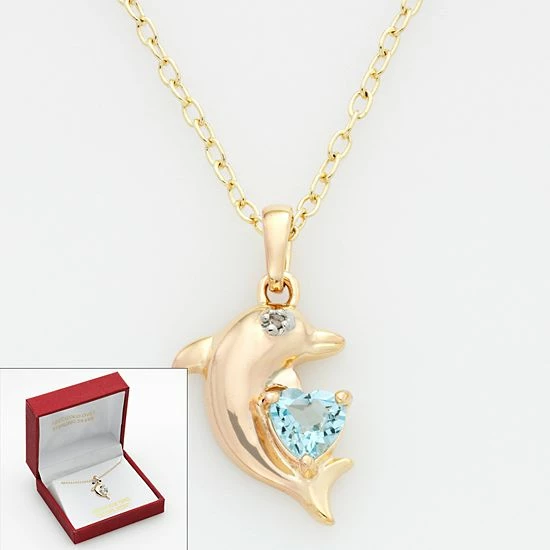 Oceans of beauty. Featuring a heart-cut blue topaz stone and tiny diamond accent, this 18k gold-over-sterling silver dolphin pendant is dazzling. Wear this charming necklace with absolutely any ensemble.