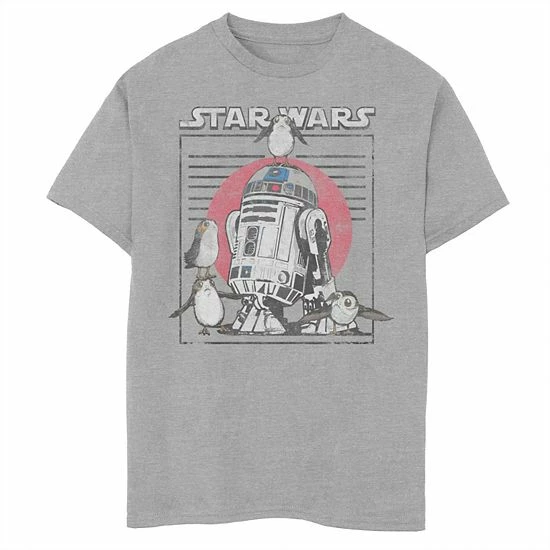He’ll love the cool look of this boys’ Star Wars Last Jedi Flock of Porgs Surround R2-D2 Graphic Tee.