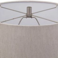 - Round hardback drum shade is a light gray linen fabric