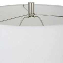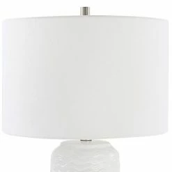 - All-white ceramic table lamp features a wavy texture, accented with brushed nickel