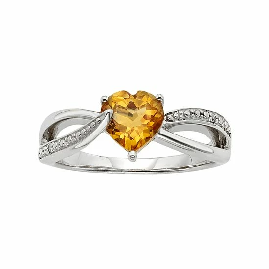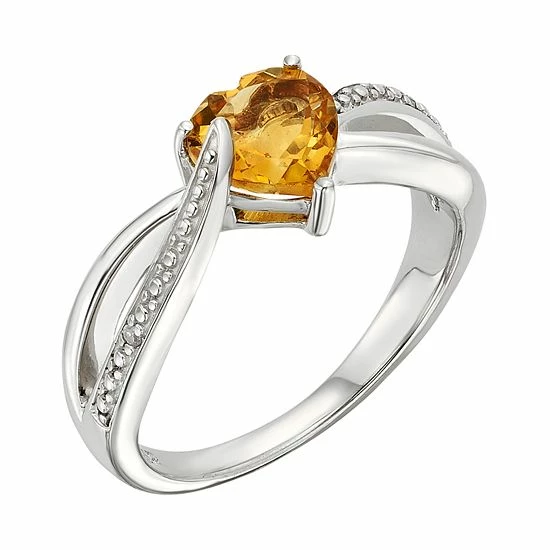 Adorned with a heart-cut genuine citrine stone set in a bypass band, this ring radiates romance. Diamond accents complete this beautiful sterling silver ring.