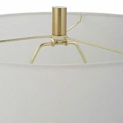 - Contemporary style table lamp features a cone shaped, glass base that sits atop an antique brass metal foot