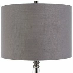 - Contemporary style table lamp features a cone shaped, glass base that sits atop an antique dark nickel metal foot