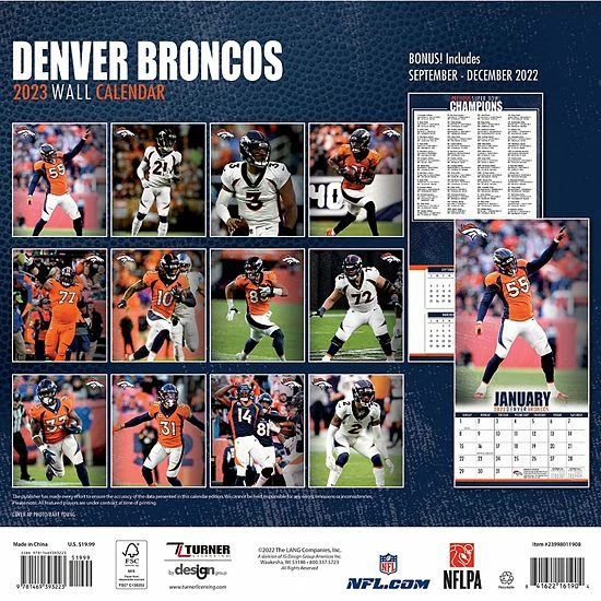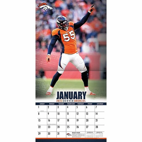Start the season off right with this Denver Broncos 2023 12 x 12 team wall calendar.